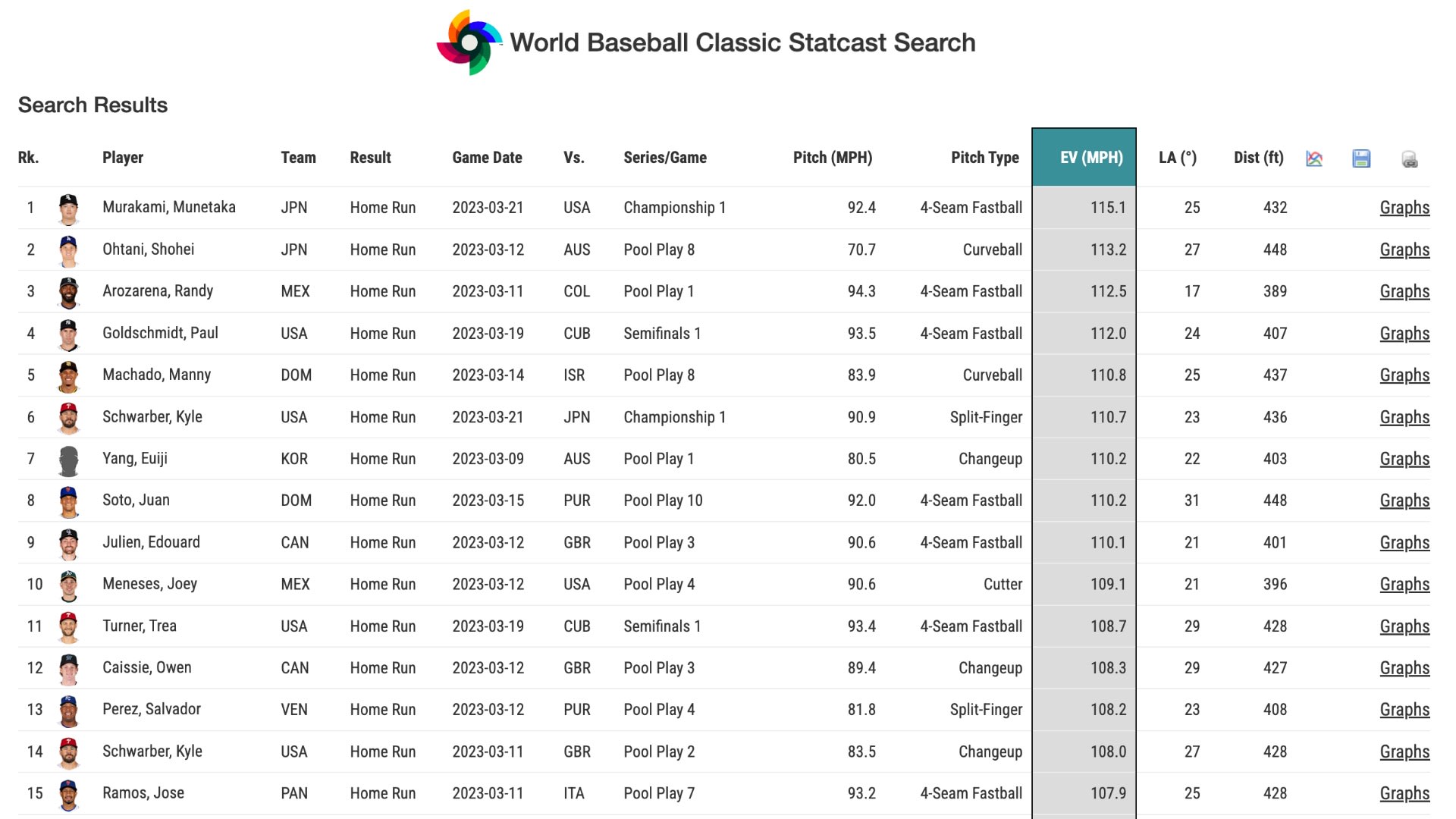 - A full Statcast search page for World Baseball Classic data is now live. Most Statcast data is available starting with the 2023 tournament, while bat tracking data will be available starting with the 2026 tournament. Data is searchable for the World Baseball Classic players and teams specifically.