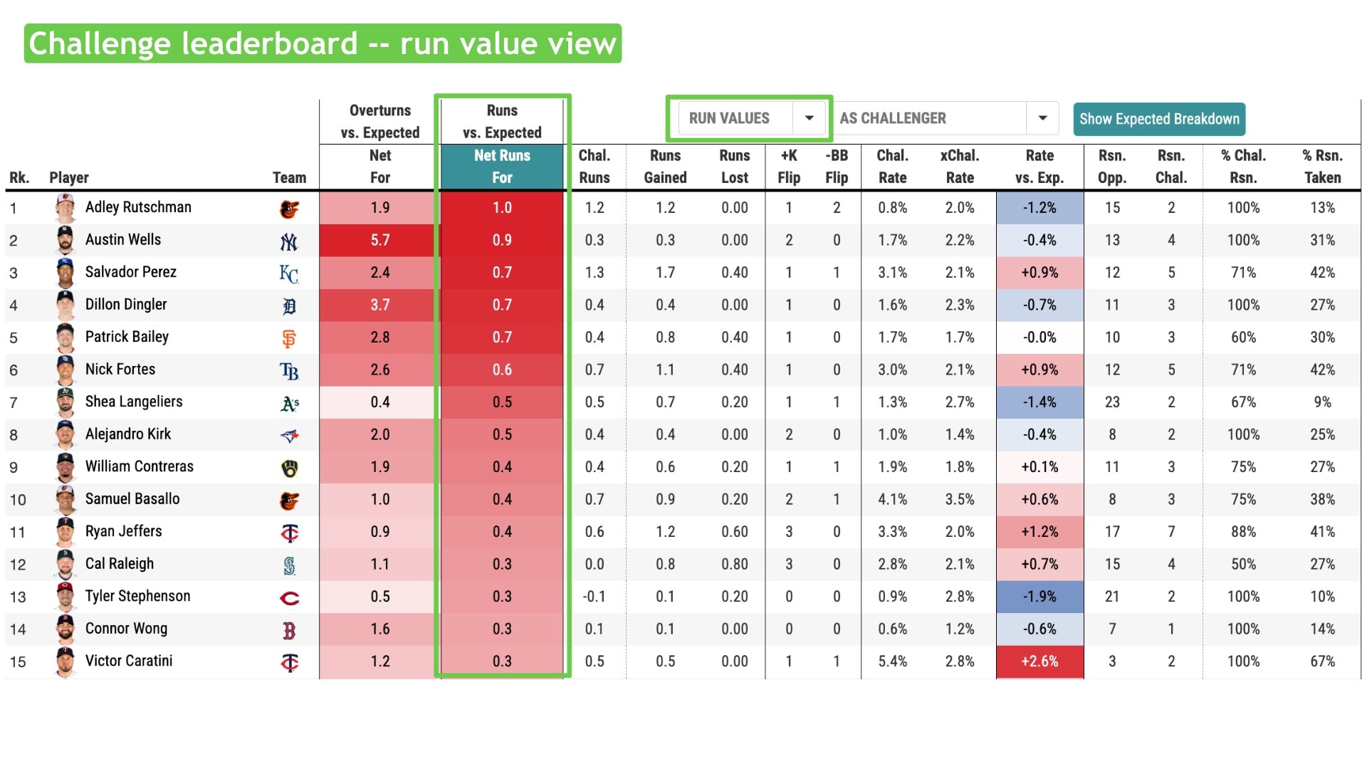 On the ABS leaderboard, in addition to total challenges made, won and lost, there is an alternate view showing the run value added from challenges.