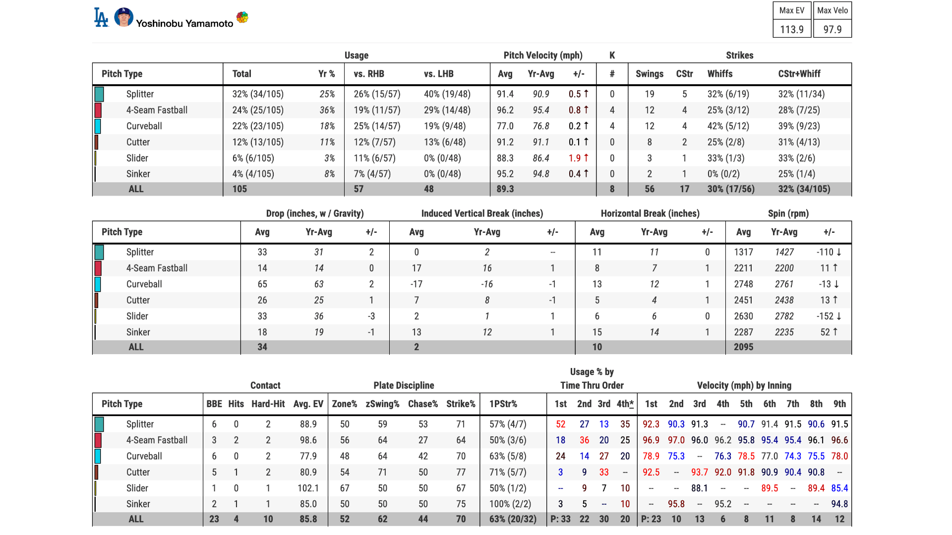 - Player Breakdown tab of the Gamefeed updated to include new metrics, including pitch usage by times through the batting order and pitch velocity by inning. (Example here)