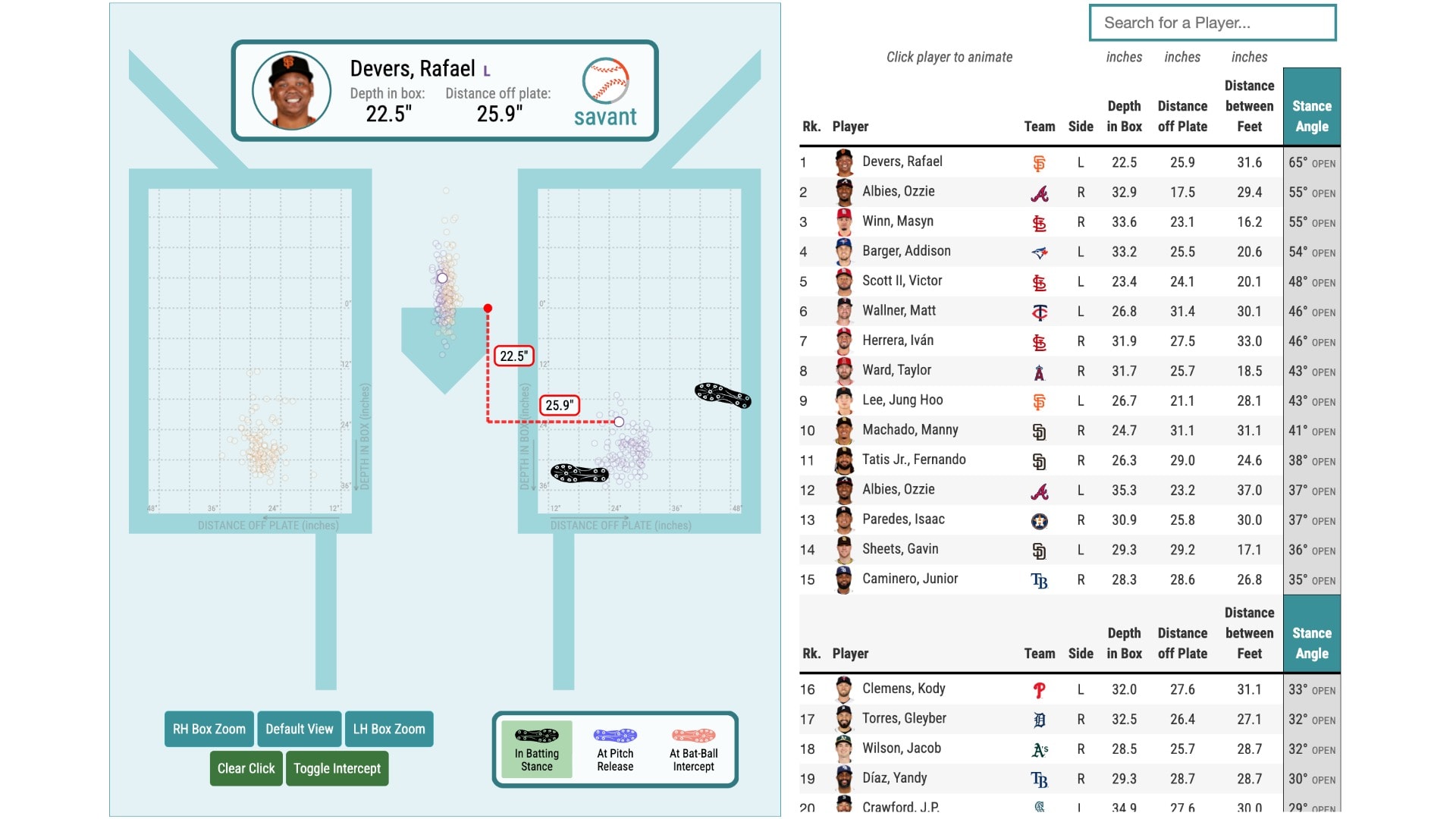 Visual showing every hitter's batting stance, including depth in batter's box, distance from home plate, distance between feet and batting stance angle.