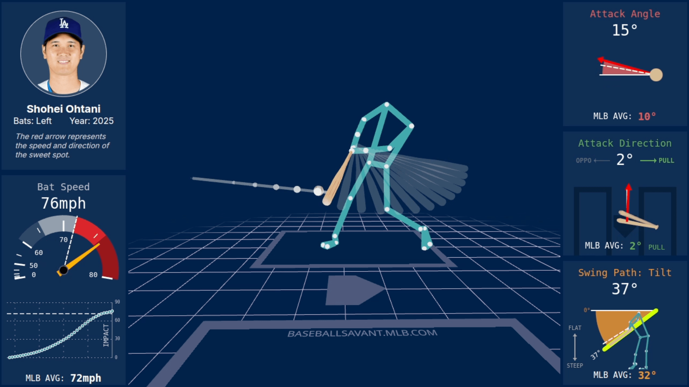 Leaderboard with new set of bat tracking metrics including hitter swing path, attack angle, attack direction and ideal attack angle rate. Dynamic visual at top of page shows any hitter's season average swing. Leaderboard also displays hitter intercept point and batting stance data. Link >>