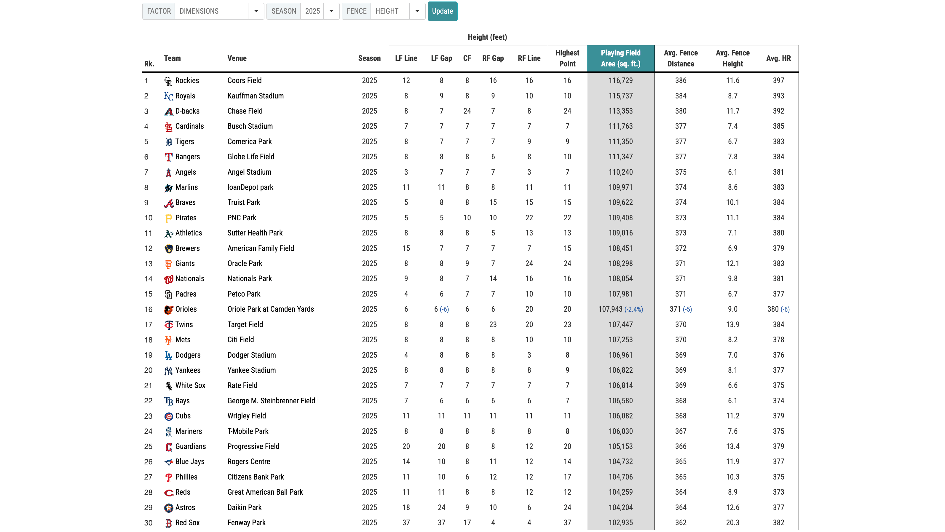 New data available within Statcast park factors page showing the following for each MLB ballpark: total playing field area, outfield fence distances and heights, average home run distance required and deepest/highest points of ballpark. Link >>