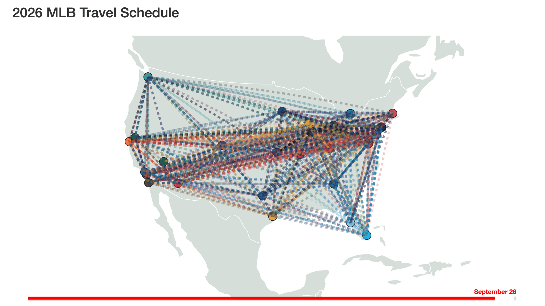 Visualization of every team's travel schedule for the 2026 MLB season with total miles traveled.