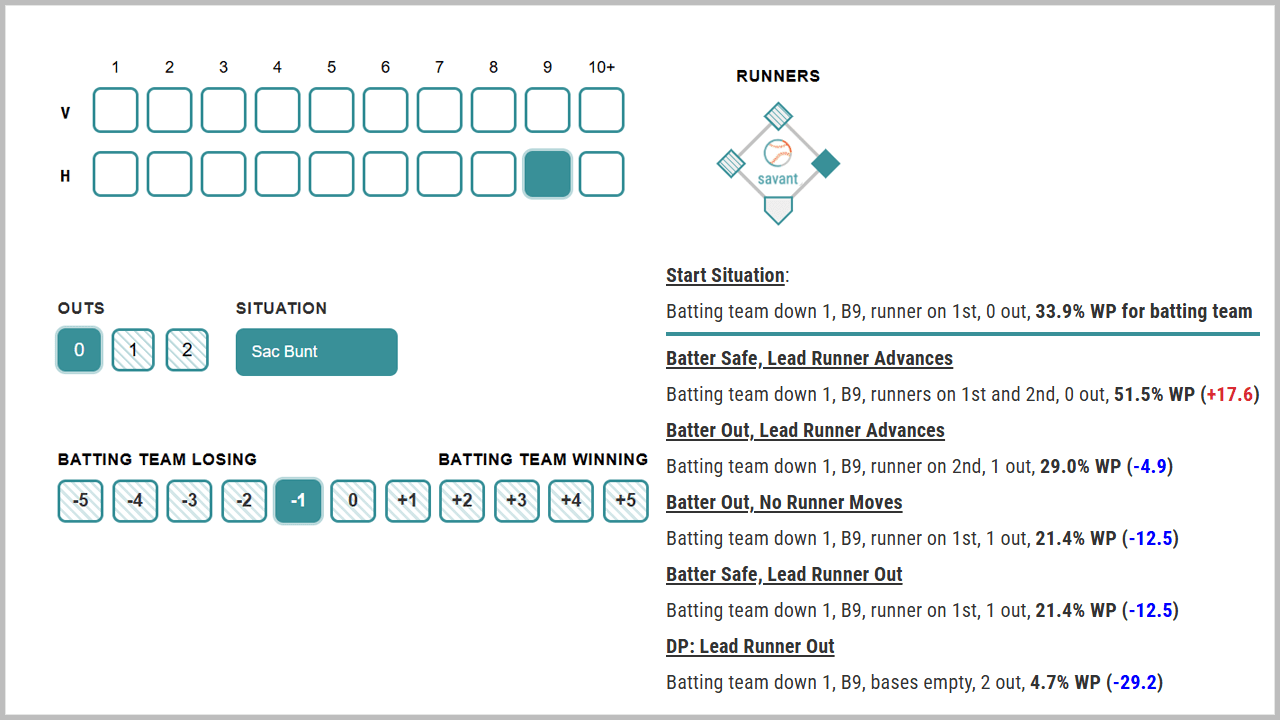 The new Game Strategy Explorer tool on Baseball Savant allows you to find the win probability or run expectancy for any MLB game situation, based on data from the last 10 seasons.