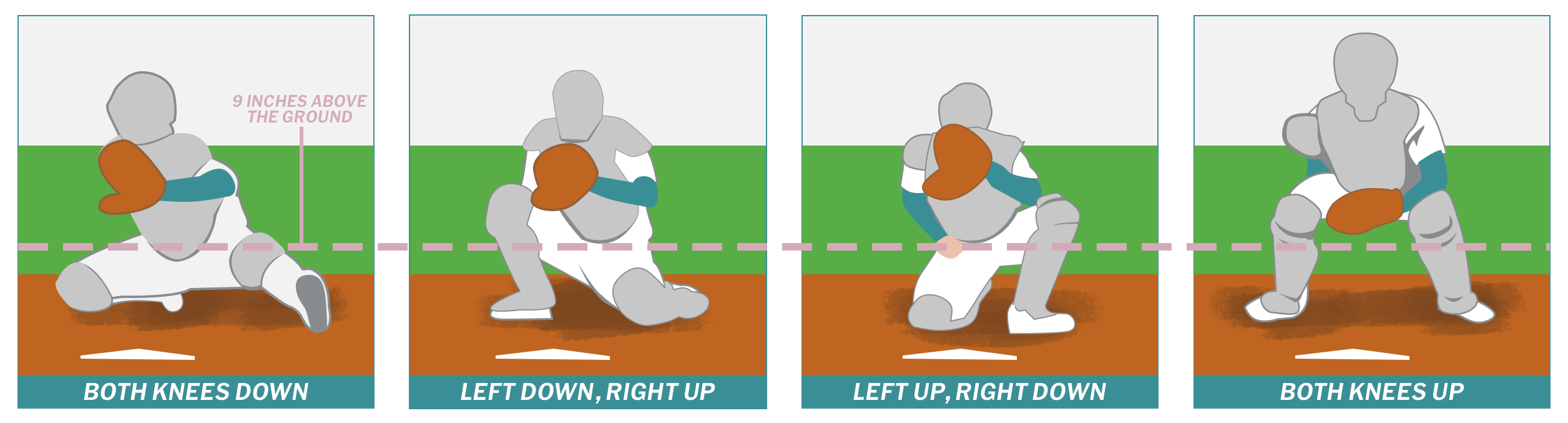 This page offers a breakdown of a catcher's or team's stance -- namely, the rate at which catcher(s) set up to receive pitches behind the plate with one or both knees down, a phenomenon which has seen a dramatic rise in popularity leaguewide with the continued understanding of the impact that such a setup can have on a catcher's ability to frame pitches. A catcher's knee is considered "down" when it is less than 9 inches above the ground at pitch release.